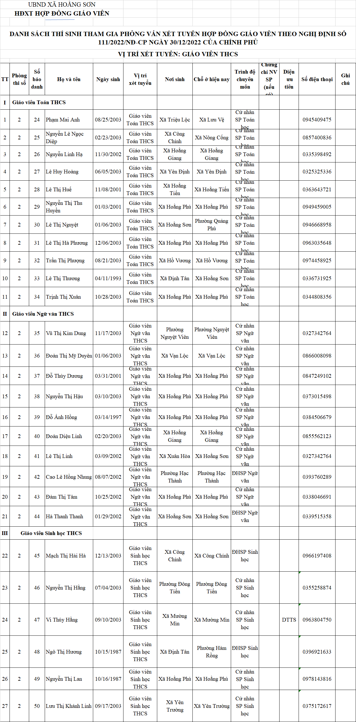 DANH SÁCH THÍ SINH THAM GIA PHỎNG VẤN XÉT TUYỂN HỢP ĐỒNG GIÁO VIÊN THEO NGHỊ ĐỊNH SỐ 111/2022/NĐ-CP NGÀY 30/12/2022 CỦA CHÍNH PHỦ VỊ TRÍ XÉT TUYỂN: GIÁO VIÊN THCS